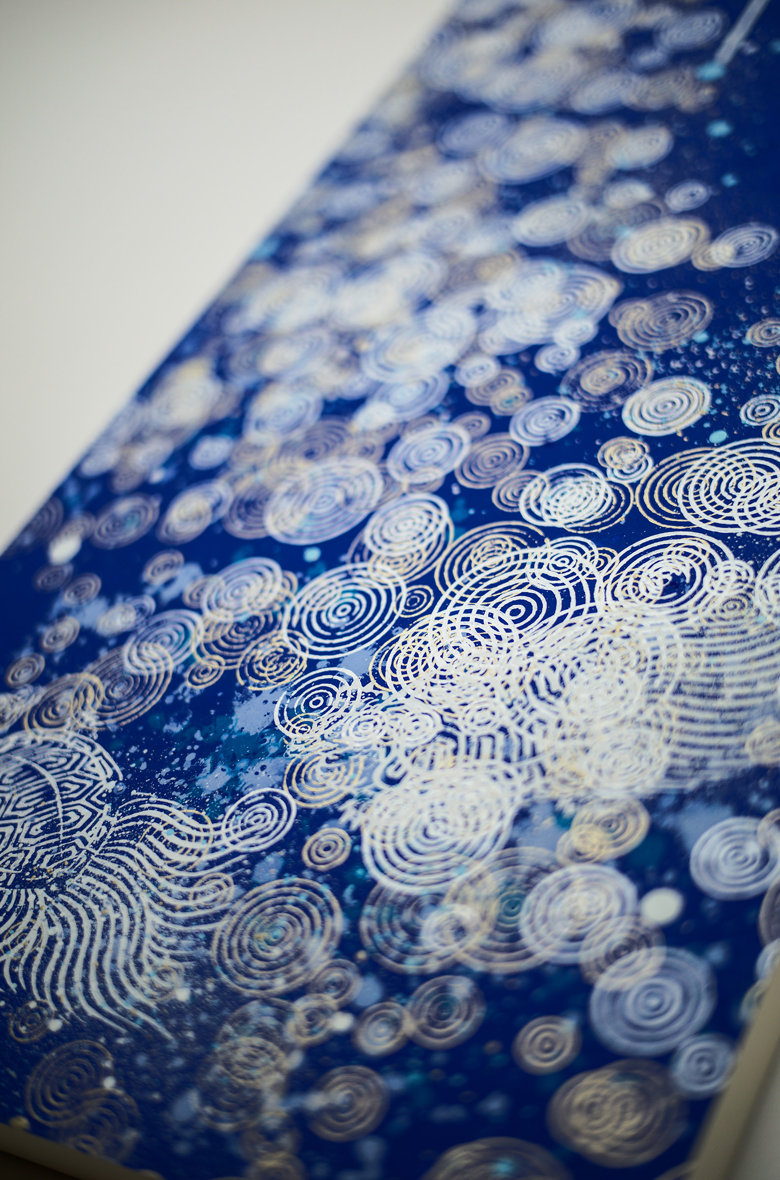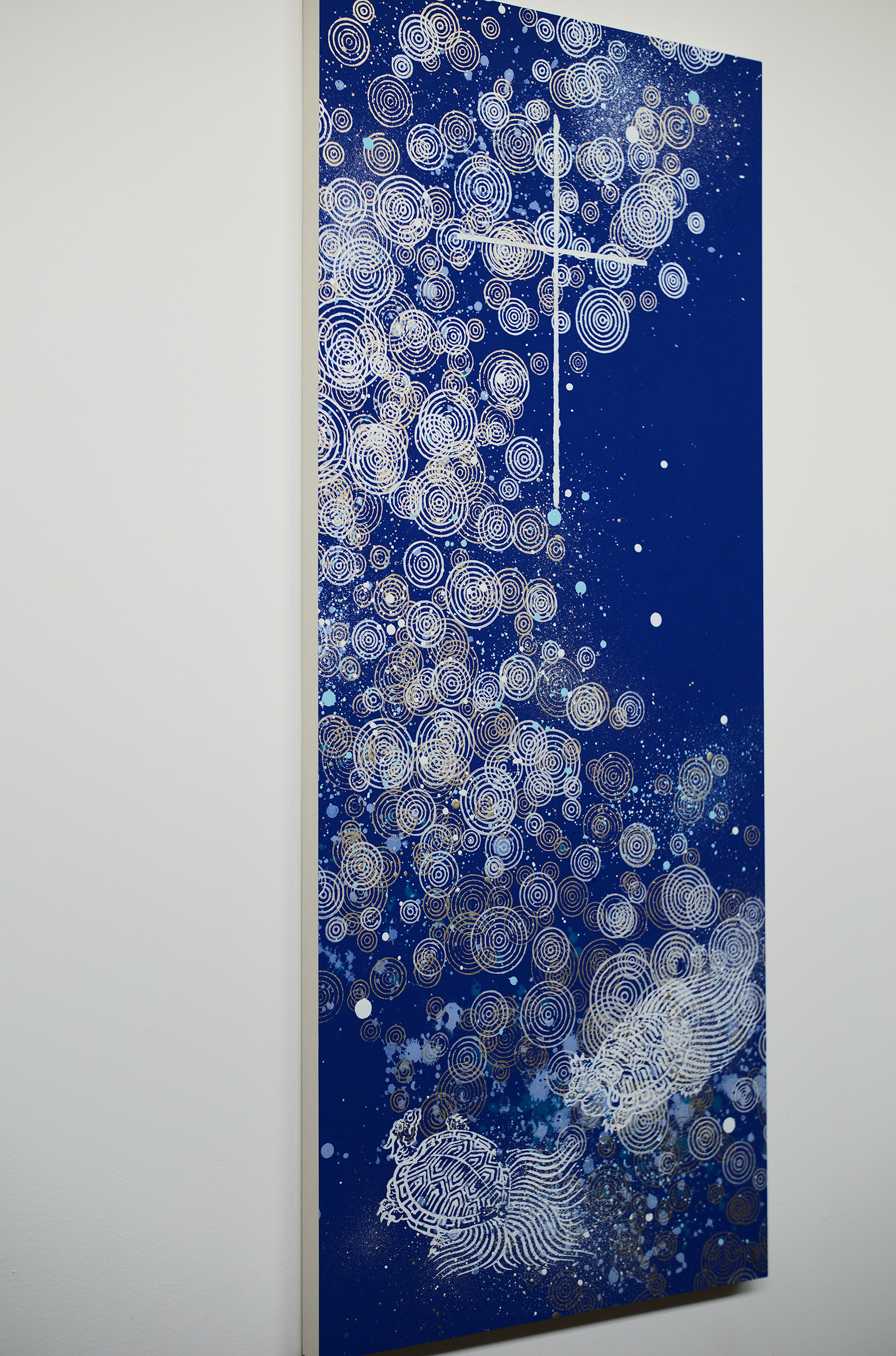 アトリエに訪れたのは敬虔なクリスチャンであるアメリカ人夫妻。ぼくが描いたクルスの作品に反応を示された夫妻と対話を重ねながら、クルスに祈りを込めた青い作品を手がけることに。ぼくの作品「ミズハ」は、渦巻文様を幾重にも重ねゆくのだが、その様を見た人が何をどう感じるかは問わない。心象風景であり、水であったり、空であったり、宇宙でもよい。この世とあの世などの別世界など、人により自由に見たもの、感じたものを解釈すれば良いと考えてはいる。ご主人は、ライフスタイルでもある海の世界、とりわけ深海の世界をイメージしたことから、この作品のオーダーへとつながった。新たに手がける夫妻の茶室の床の間に飾る絵として襖の唐紙と共に依頼を受けた。不慣れな英語でのやり取りを通じてではあったが、美は国境を越える、と思い取り組んだ。