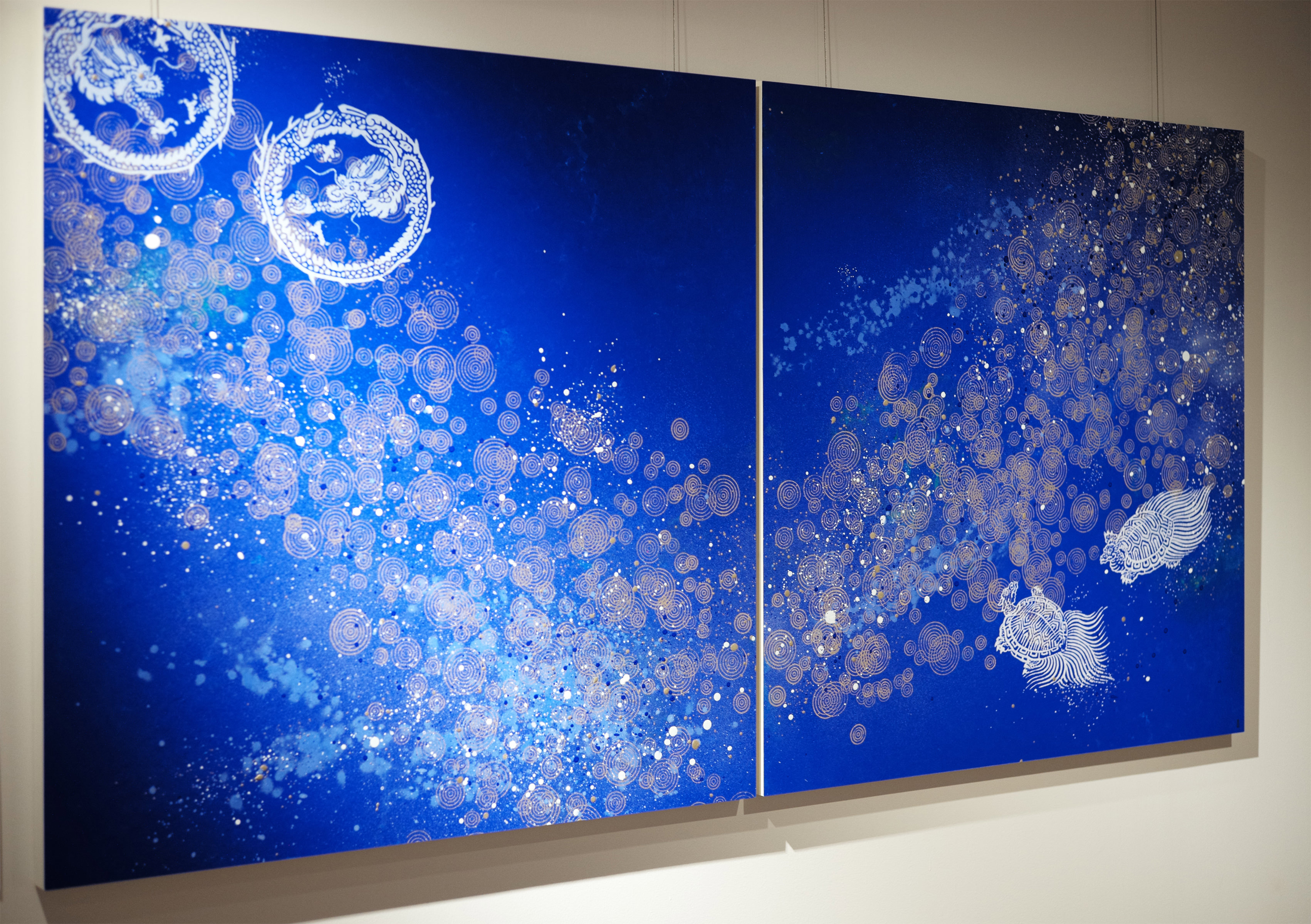この唐紙には、やがて龍になる神さまの使いである亀が人々の祈りを連れて、天空へと舞い上がり龍となって願いを叶え、世界平和を見守るというメッセージが込められている。