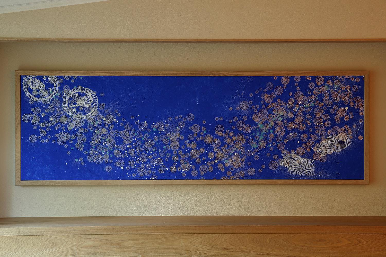千田長右衛門 BLUE ART About Art Works Order ミズハ 「ミズハ」とは、水のカミさまと共に在ることを願い生まれた作品。波紋のエネルギーをスパークさせる中、唐紙は八百万の神々と共に手がけるという千田長右衛門の思想に基づいたもの。 この唐紙には、やがて龍になる神さまの使いである亀が人々の祈りを連れて、天空へと舞い上がり龍となって願いを叶え、世界平和を見守るというメッセージが込められている。 2019年夏千田長右衛門 ミズハ │ 文珠荘 舞の棟 Art Works Composition季風の道昇龍SAGA瑞雲に鶴亀星に願いをミズハムジナモ輪葉+細渦など More
