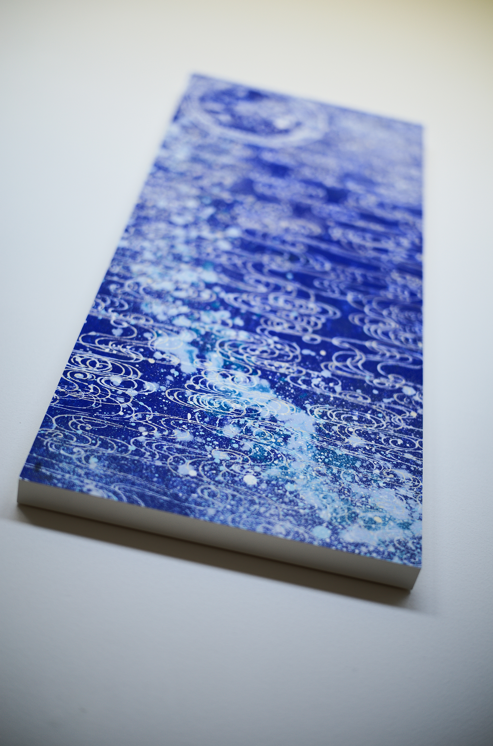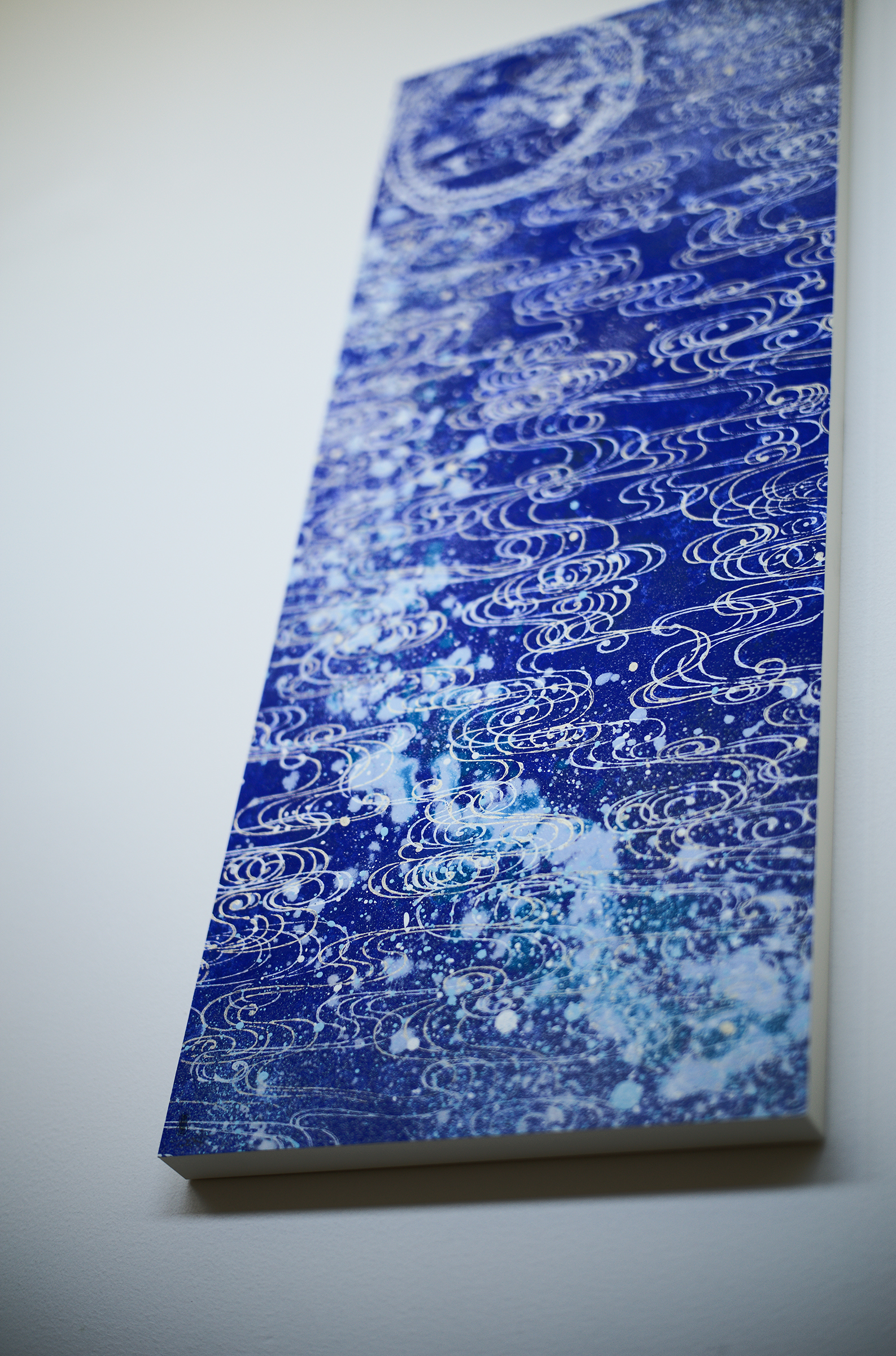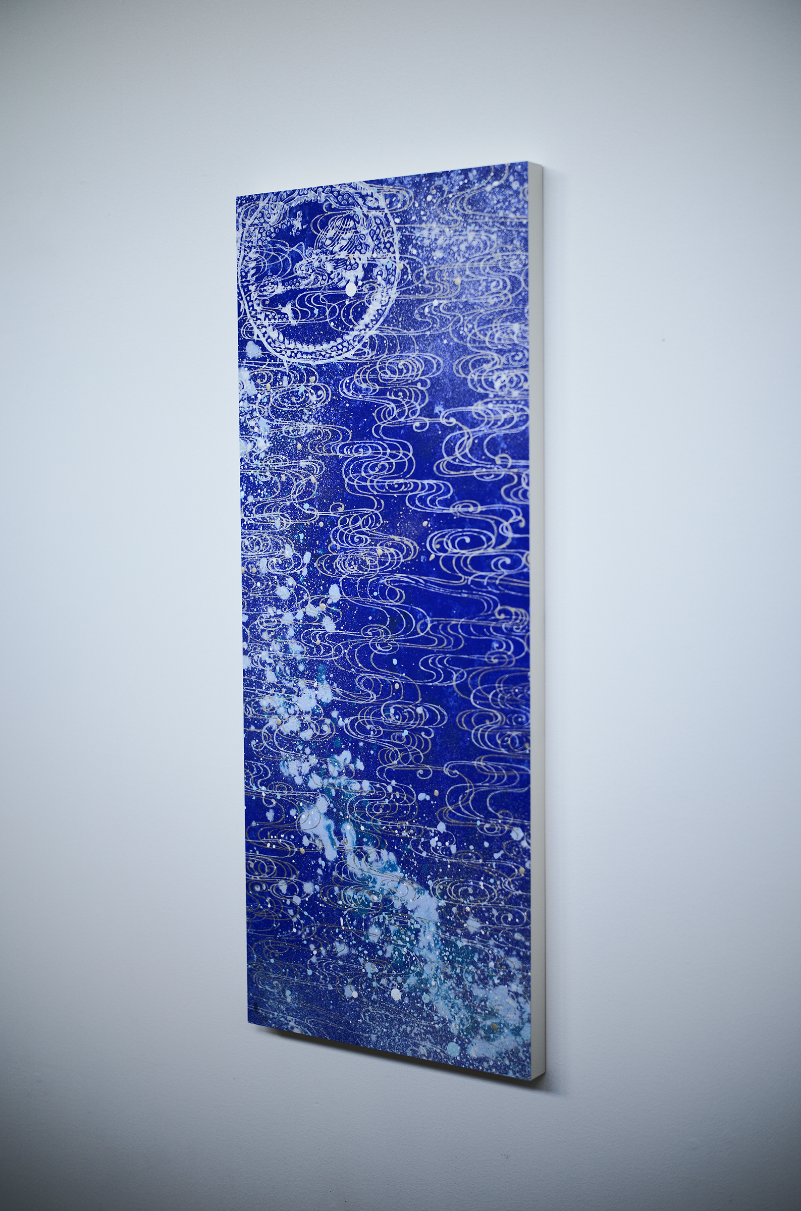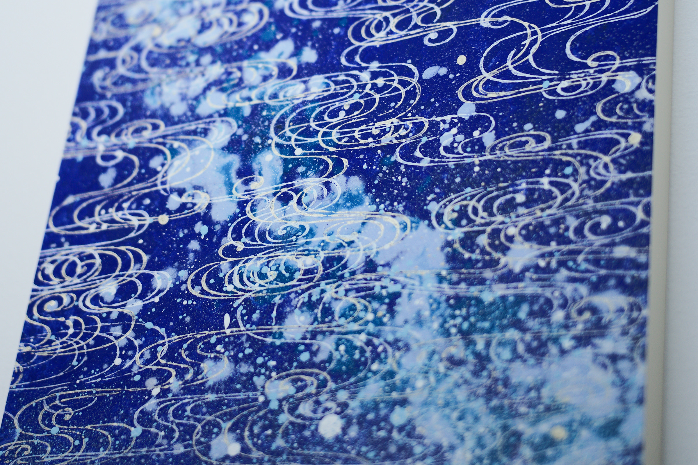 心象風景としてたらし込みを用いて下から上へと上昇するイメージを描いたこの作品には龍神さんが顕れました。たらし込みは、100%コントロールできるものではなく、意識と無意識の間から生まれる産物でもあるゆえ、そこに醍醐味と面白みを感じます。毎回毎回が1度きりの見極めが問われるのです。今ある景色に手を加え制作を進めると言うことは、二度と戻れぬ景色に足を踏み入れることでもあります。やっぱりやめたとはならないですし、元ある場には戻れません。目の前の一期一会の瞬間をどう捉えるかで、その作品が持つ方向性も表情も風合いも大きく変化してゆきます。