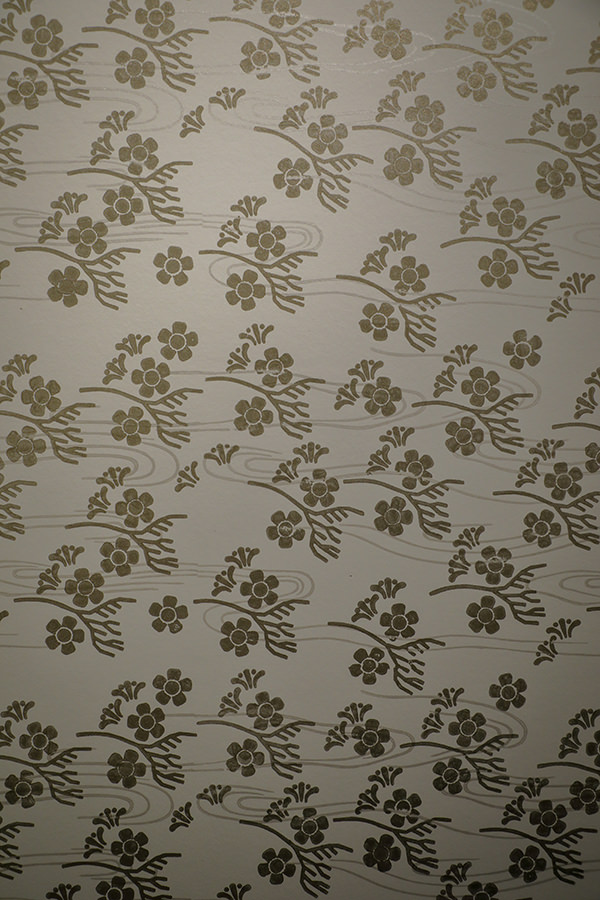 梅花藻は清らかな水でしか育たないことから、この文様は清浄を意味します。千田長右衛門は、文様は祈りの風景、祈りの記憶であると提唱しています。これは、千田長右衛門と植物園職員、そして、その縁を繋ぎコラボレーションに関わった池田泰子、3者のある日の散策の記憶を留めたもので、千田長右衛門の1枚の写真から生まれました。美しく煌めく水面にゆれる小川の風景に佇み、感じた思いを形にした文様です。清浄と浄化が、やがて心の平穏をもたらすことを願いました。また、花言葉は幸せになる決意と言われることから、心願成就の意味もあります。