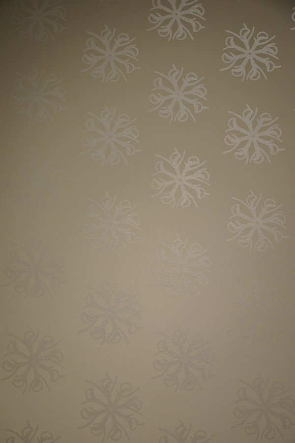 ムジナモ輪葉Mujinamo Rinyo平成令和の百文様(開板/平成令和の百文様(開板/令和六年葉月)) 吉祥の報せ、縁繋ぎ 絶滅危惧種を知ること、見たことで生まれたもので、その小さな姿に命ある世界の愛おしさを思い文様化しました。希少価値ある花は滅多に咲かない上、短時間しか咲かないことから、とても縁起が良い報せの意味を持ちます。京都府立植物園と唐長のコラボレーション文様。 文様説明/唐紙師 千田長右衛門